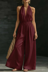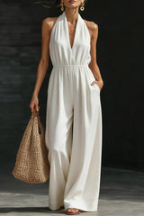 Solid Color V-neck Sleeveless Backless Casual Pocket Loose Wide-leg Jumpsuit
