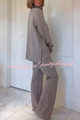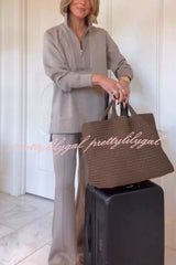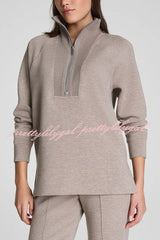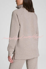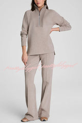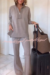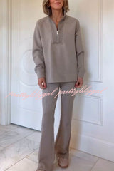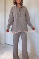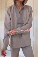 Alfia Ribbed Stand Zipper Neck Long Sleeve Sweatshirt and Button Elastic Waist Pocketed Loose Pants Set