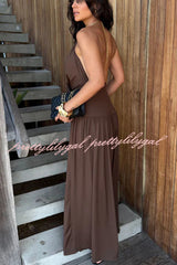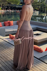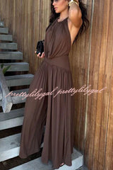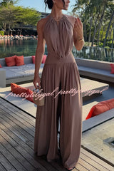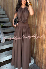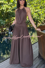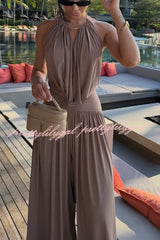 Lightweight Chic Metal Ring Drape Cowl Halter Neck Bodysuit and Elastic Waist Wide Leg Pants Set
