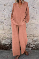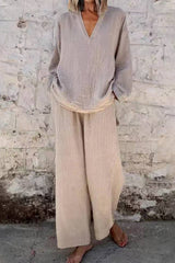 Linen Blend V-neck Long-sleeved Loose Top and Elastic Waist Pocket Casual Wide-leg Pants Set