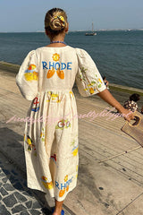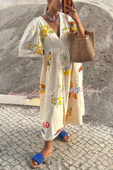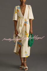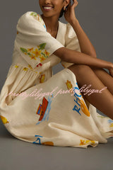 Cozy Summer Linen Blend Unique Print Button Puff Sleeve Loose Midi Dress