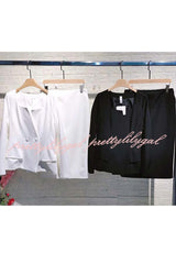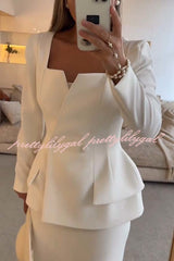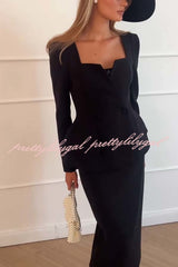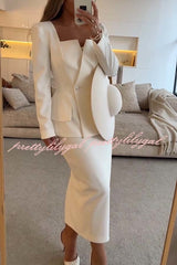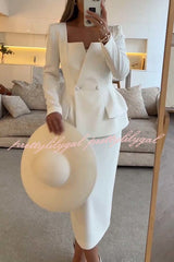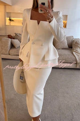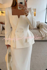 Sculptural Elegance Square Neck Button Blazer and Elastic Waist Pencil Midi Skirt Set