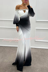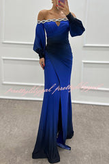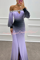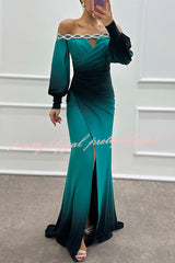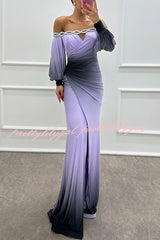Julieta Gradient Print Boat Neck Off Shoulder Gem Detail Slit Gown Maxi Dress