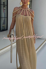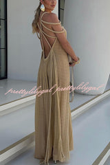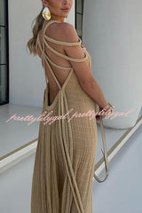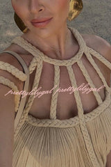 - Modern and sophisticated - an absolute stunner of a column gown! Symmetrically placed handwoven detailing creates a soft cage-like effect at the neckline with beautifully draped braids at the shoulders. Follow the braids to the back, to reveal an interconnected arrangement of intricate lines. This long, lean silhouette can be worn belted for a more conservative drape or without ties to create an eye-catching plunge back.