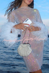 - Mini dress with wide sleeves, complemented by an ostrich feather. Made of open knit fabric with rhinestone embellishments throughout.