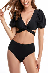 Solid Color V-neck Crisscross Tie High-waisted Two-piece Stretch Bikini Swimsuit