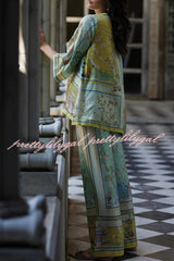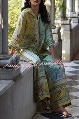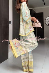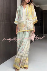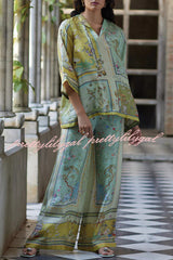 Elonie Satin Floral Print V-neck Half Sleeve Top and Elastic Waist Wide Leg Pants Set