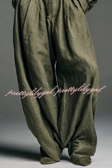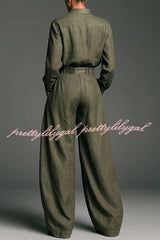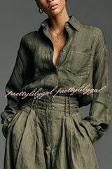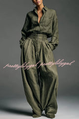 Linen Blend Lapel Long-sleeved Casual Shirt and High-waist Pocket Loose Wide-leg Pants Set