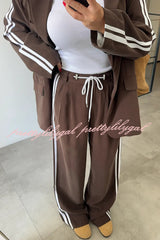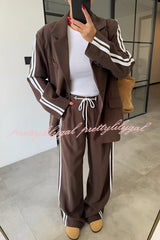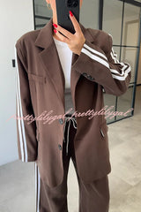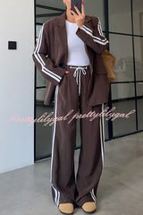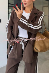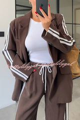 Levvie Striped Trim Long Sleeve Lapel Blazer and Rope Belt Pocketed Wide Leg Pants Set