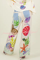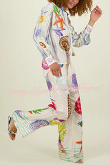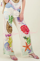 - Featuring a marine themed print, the waistband has a button closure, 3 belt loops, and elastic at the back. Marine prints feature vibrant large shells, sea animals and plants. Pair with our matching top for a fresh summer look.