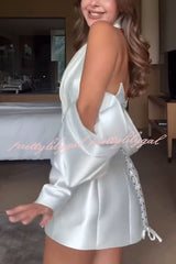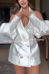 Muse Satin Double-breasted Split Puff Sleeve Back Lace-up Halter Blazer Mini Dress
