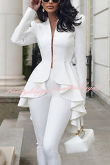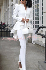 Emmie Stand Collar Ruffle High Low Hem Blazer and High Rise Stretch Pencil Pants