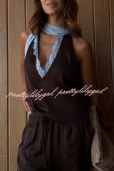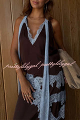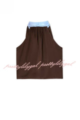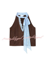 - Designed to be worn both ways, this top elevates any outfit! The tie fastenings in a gorgeous blue lace, that continues into the neckline, beautifully contrasts the deep chocolate brown top making the piece feel super luxe and premium. Pair with the matching skirt of a chic co-ord or tone down with some scallop jeans and a heel.