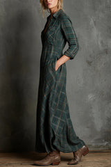 Plaid Print Lapel Long Sleeve Casual Pocket Single-Breasted Maxi Dress