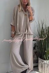 Fashion Striped Print Lapel Loose Top and Elastic Waist Casual Wide-leg Pants Set