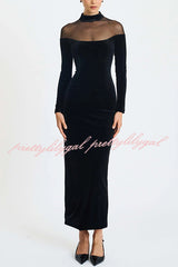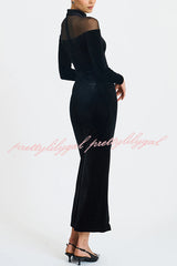 Fashionable Velvet and Mesh Spliced long-sleeved Slim-fit Maxi Dress