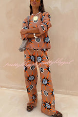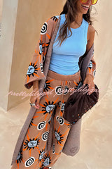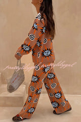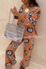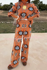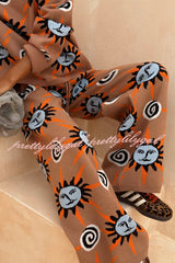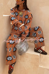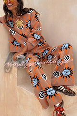 Mediterranean Art Knit Unique Sun Vortex Print Elastic Waist Wide Leg Pants