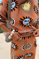 - Our best-selling soft stretch sweater features a new tan sun print! The hand-painted sun and swirl pattern is inspired by Mediterranean art. Pair it with a matching sweater or cardigan for an effortlessly stylish look.