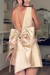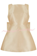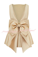 - Get wrapped up in opulence this season. This gold mini crafted from our coveted, luxurious satin, remains simplistic in the front, one quick twirl unveils a sophisticated V-cut back and statement bow. Our distinctive clothing will add instant style to your wardrobe.