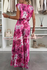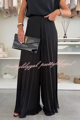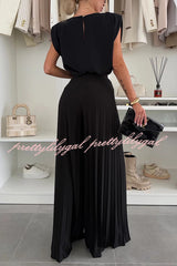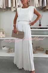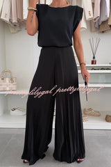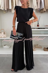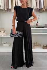 Fashionable Round Neck Shoulder Pads Top and Elastic Waist Pleated Wide-leg Pants Set