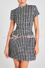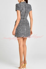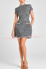 Eve Check Bouclé-tweed Fabric Pearl Trim Short Sleeve Pocketed Mini Dress