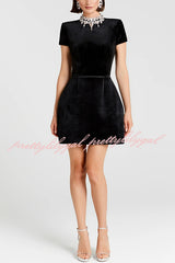 Regan Luxurious Velvet Jewel-encrusted Turtleneck Short Sleeve Pocket Tulip Mini Dress