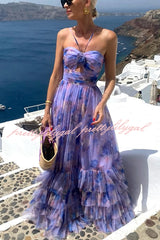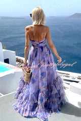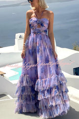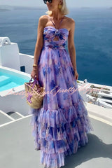Dreamy Clouds Tulle Printed Rose Detail Cutout Ruffles Tiered Halter Maxi Dress
