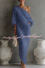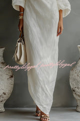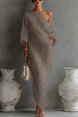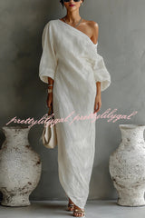 Linen Blend Loose-fitting One-shoulder Lantern Sleeve Casual Pocket Maxi Dress