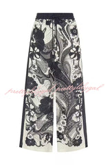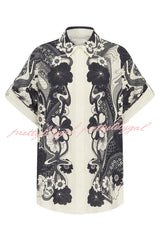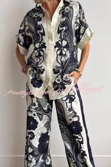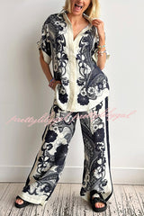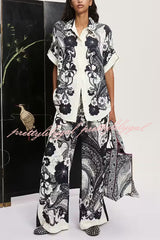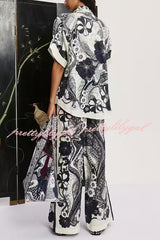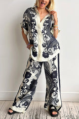 Linen Blend Lapel Short Sleeve Loose Top and Elastic Waist Casual Pocket Wide Leg Pants Set