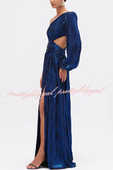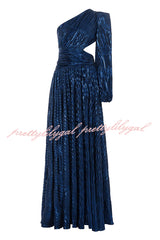 Dazzling Night Metallic Pleated One Shoulder Cutout Balloon Sleeve Gown Maxi Dress