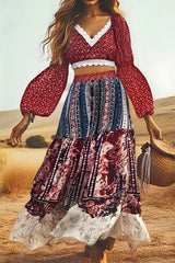 Unique Printed V-neck Long-sleeved Cropped Top and High-waisted Spliced maxi Skirt Set