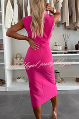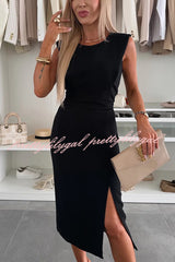 Charming Lady Solid Color Round Neck Sleeveless Waisted Slit Stretch Midi Dress