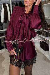 Telsi Satin Bow Neck Shoulder Pads Long Sleeve Lace Trim Mini Dress