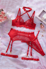 Valentine's Day See-through Lace Hollow-out Halter Neck Bra Four-Piece Set
