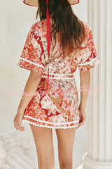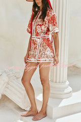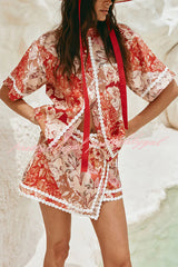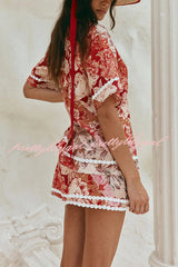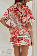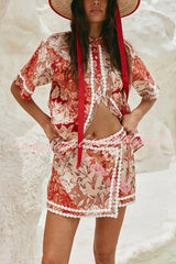 Floral Print Collared Short-sleeved Loose-fitting Shirt and Casual Floral Trim Mini Skirt Set