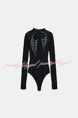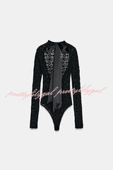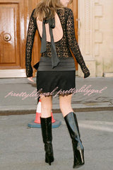 Anna Semi-sheer Lace Long Sleeve Back Bow Tie-up Cutout Stretch Bodysuit