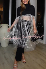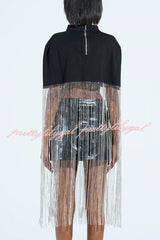 - The New Level Shiny Fringe Cropped Cape is a dramatic cape-style shirt. It features a stand-up collar, a stretch-knit hem, faux front pockets, and extra-long rhinestone fringe detailing. The cuffs are rounded for a draped look. Wear it with a knit midi dress and knee-high boots.Our distinctive clothing will add instant style to your wardrobe..