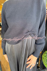 Practical Fashion Knit Ruched Sweater and Satin Stretch Tank Midi Dress Two-piece Set