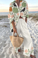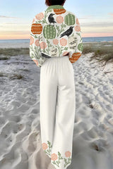 Crow and Pumpkin Print Oversized Shirt and Elastic Waist Pocket Pants Set