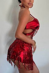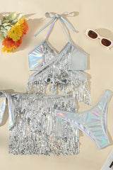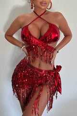 Metallic Halter Neck Tassel Stretch Bikini Swimsuit and Tassel Tie Skirt Three-piece Set