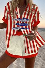 Sardine Stripe Print Loose Button Elastic Waist Shorts Set