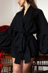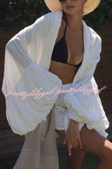 Solid Color Loose Long-sleeved Tie-front Top and Elastic Waist Casual Shorts Set
