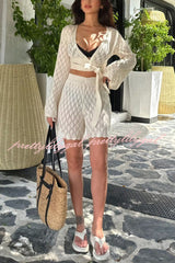 Solid Color V-neck Long-sleeved Tie-up Top and Elastic Waist Casual Openwork Shorts Cover-up Set