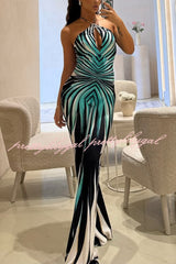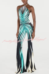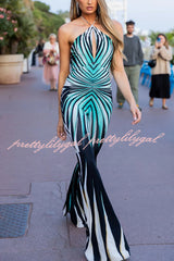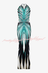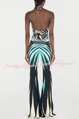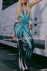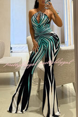 Unique Striped Print Halter Neck Cutout Tie-up Casual Flared Jumpsuit