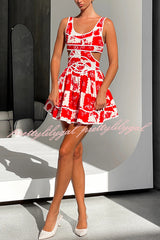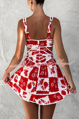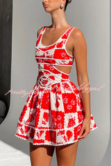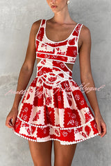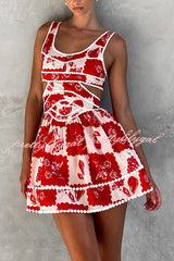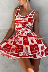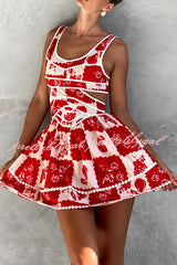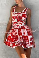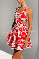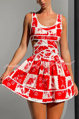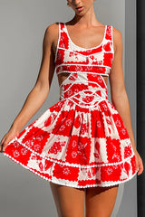 Holiday Colors Ric Rac Trims Unique Print Cutout Round Neck Mini Dress