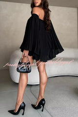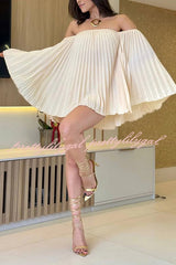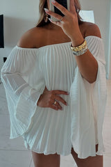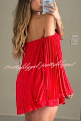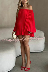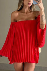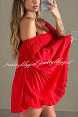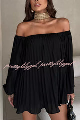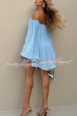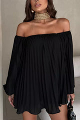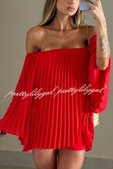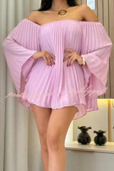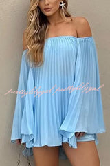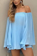 Solid Off-the-shoulder Pleated Loose Top and Elastic Waist Shorts Set