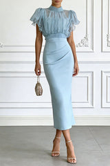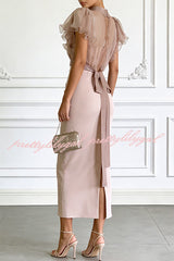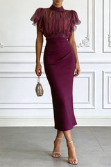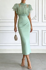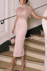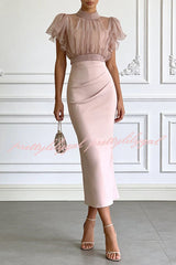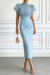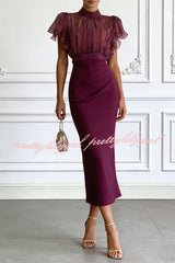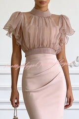 Sheer High-Neck Ruffle Sleeve Back Tie-up Top and Slip Ruched Midi Dress Two Pieces Set