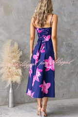 Floral Print Spaghetti Strap Backless Tie-up Elegant Slim-fit Midi Dress