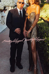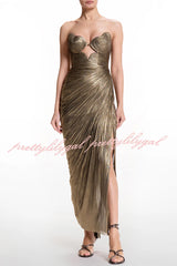 Amisha Metallic Pleated Shell Cups Hollow Gold Pendant Strapless Drape Slit Maxi Dress
