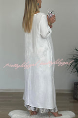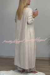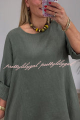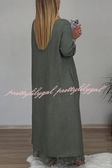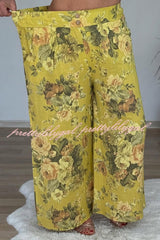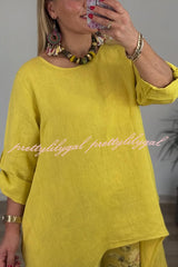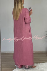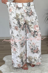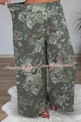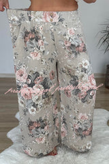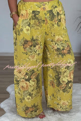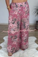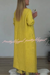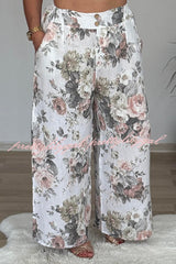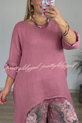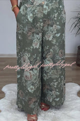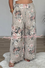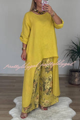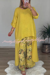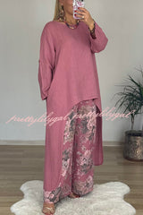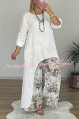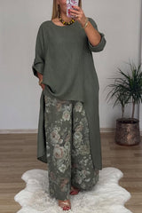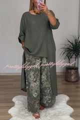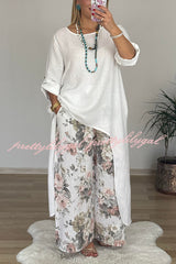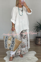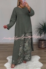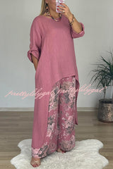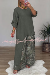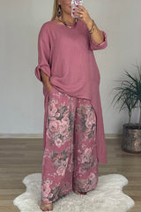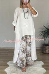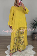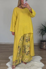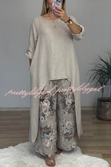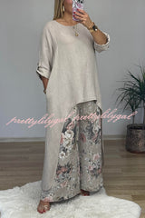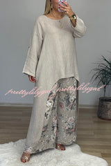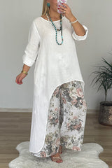 Linen Blend Crew Neck Long Sleeve Irregular Loose Top and Elastic Waist Floral Print Casual Pocket Set
